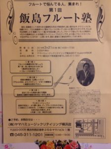 横浜ヤマハにて、色々なひとにフルートをもっと上手くなってほしい、という師匠の願いのもとに企画されたフルート塾。
